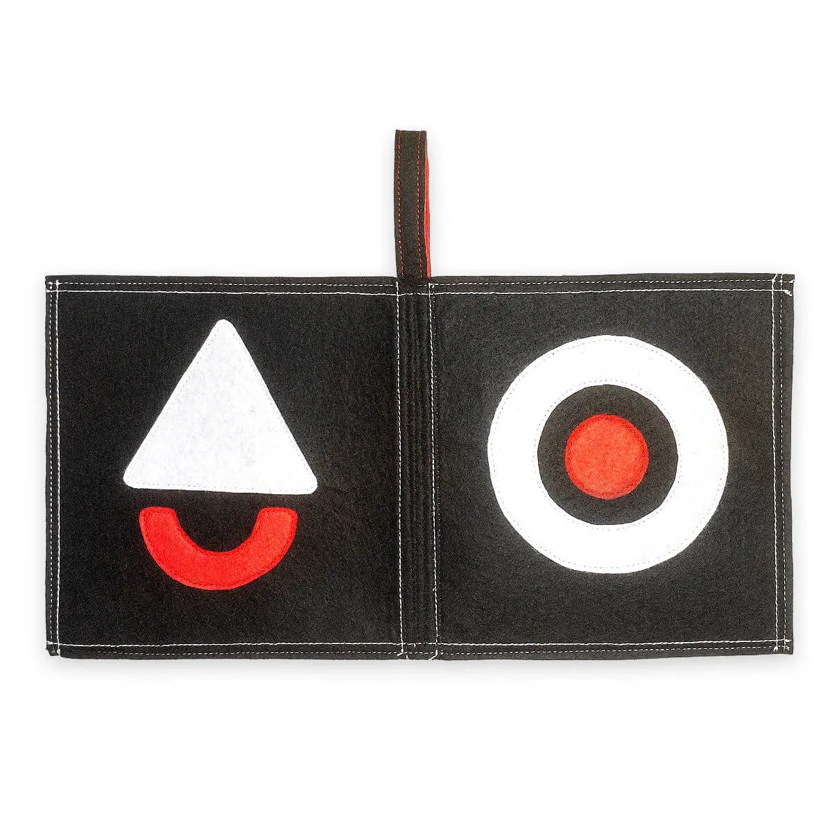Skynörvunarbók úr flísefni með rúmfræðilegum formum í svörtu og hvítu, tilvalin til að örva skynfæri ungbarna og smábarna. Handgerð með styrktu saumum og handfangi fyrir auðvelda meðhöndlun, mælt með af kennurum fyrir snemmtæka sjónörvun. Engar harðar og stífar hlutir, né lausir eða smáir hlutar.